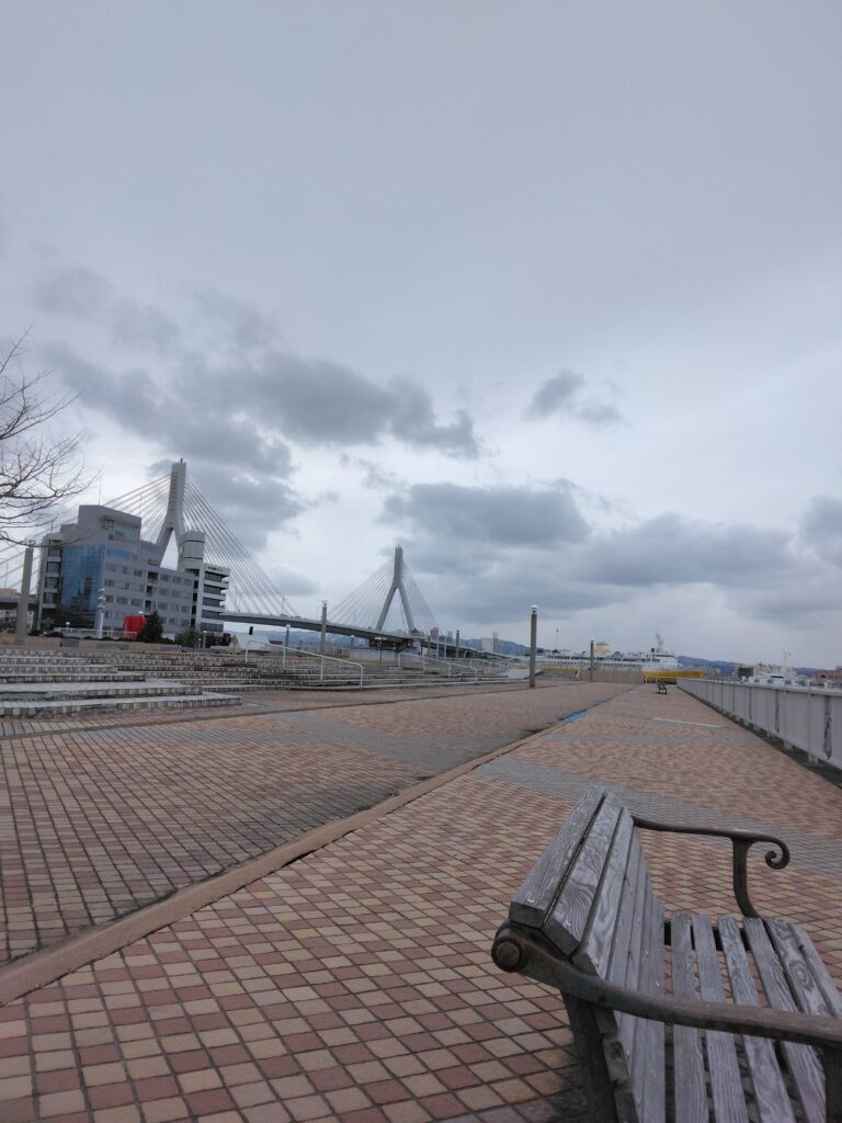 青森に旅行に行ってきた。旅行の目的の一つに「海をみながらぼんやりしたい」というのがあったが、青い海公園という丁度良い場所を発見した。青森県観光物産館アスパムの裏手にあり、青森駅からもほど近い。